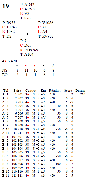 Tout le match se passe bien, en plus, c'est là ou on est chanceux, Didier va faire une atrocité en chutant 5♣ qu'il était quasi le seul à appeler alors qu'il y a 11 quasiment de tête, ce qui aurait été dramatique dans un match serré, mais là ne coûtera presque rien puisqu'on va gagner 47/4 pour scorer 18.8 PV. Bon ça aurait fait 20/0 ça aurait été joli!